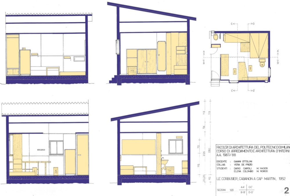 さらにこの休憩小屋はただの小屋と違い、「実験小屋」とも称されています。そのわけは、コルビュジエ自身が提唱した「モデュロール」というヒューマン・スケール(身体寸法)と美的プロポーションの典型と言われている「黄金比」を融合させた独自の寸法体系を、この小さな小屋を設計する際に適用しているのです。同年(1952年)に完成したマルセイユのユニテ・ダビタシオンは、最小限空間をモデュロール(黄金尺)で構成した住居単位として、それらを集合・累積し、大規模な集合住宅に適用しています。ただしこの休憩小屋では、「モデュロール」を基本としながらも厳格に拘束することなく、窓の高さなどでは、生活行為からの自分の目線の高さにあわせ、現場で変更もしているのです。このことは、モデュロールが必ずしもコルビュジエにとって絶対的寸法ではなく、根底には理論より現場での「自らの感性」を優先する思想があったからにほかありません。