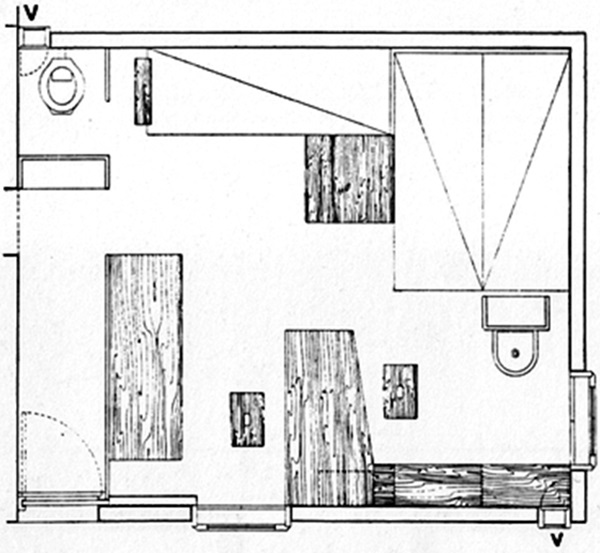 「質素で簡易的」であるこのバナキュラー(Vernacular:その土地に根付いた)な小さな休憩小屋は、波型石綿スレート葺きの片流れ屋根で、外壁の仕上げは地元の廃材となった木材の太鼓落としで生じた端材を張り合わせた一見ログハウスに見える簡素な休憩小屋です。室内の天井と壁面は合板で、床はモミの木のフローリングOPとなっています。家具類は耐久性に富み、比較的安価で木目が美しいオーク材を使用。ベッド、テーブル、スツール(背もたれと肘掛けがない簡易的な椅子)やクローゼット、等で必要最小限に皮膚環境の延長として配置構成さています。とくに手足が触れるであろう家具や建具の取っ手などには、ほとんどR加工が施されています。住設は洗面器と便器がむき出しで台所はありません。この小さな小屋は、ヒトデ軒(食堂)と隣接しているからです。さらに小屋周りの植栽は、イナゴマメやアロエ等が植え込まれています。