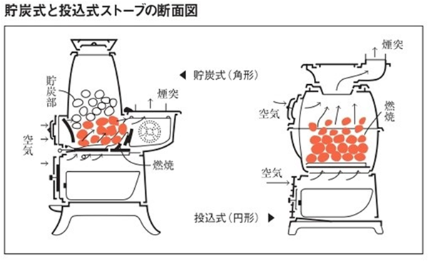 一方、貯炭式はドイツのユンケルストーブを参考に考案されたストーブで、煙突を胴の横部につけて空気を横に流す(横向き通風式)。この機構により、まず空気が流れる燃焼部にある石炭を燃焼させ、次に燃焼部の上部(貯炭部)の石炭が燃焼する仕組みになっている。また、胴体に縦や横方向の「ひれ」をつけることによって、放熱面積を広げ、放熱効果の増大を図る工夫もなされていた。燃焼時間が長く、給炭回数も少ない。投げ込み式のように給炭のたびに煤煙や粉塵の噴出もあまりない貯炭式の登場により、一般家庭にも石炭ストーブが普及していったのである。