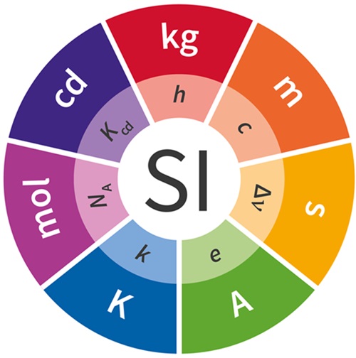 国際単位系(SI)では、7つの定義定数を起点として、7つの基本単位が表現され、それら基本単位を用いて組立単位が導かれます。 右に示すロゴは、国際度量衡局(BIPM)によるもので、それぞれの基本単位に対応する定義定数が表されています。