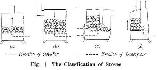 II. 試 験に用いたストーブと石炭1. 石炭ストーブの分類 石炭ストーブは,通気方向および燃焼方向によつてつぎのように分類される。すなわちFig.1に示すように,(a)上向通風上向燃焼型,(b)上向通風下向燃焼型,(c)横向通風上向燃焼型,(d)下向通風上向燃焼型である。これら4つの型のうち,(a)型は構造