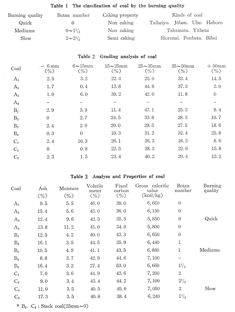 結性のある石炭では,火持ちも燃焼状態も異り,たき方もかえなければならない。従つて適するストーブの種類も同じではない。そこでわれわれには,どの種類の石炭でも具合いよくたけるストーブをつくるか,どのストーブでもたける石炭を供給するか,の問題が投げかけられる。可能と不可能,困難と容易を分析し,結局は歩みよらなければならないとしても,燃料と燃焼器具それぞれの燃焼性の本質を正しく把握することが先決である。同じ石炭でも日本の石炭は欧米の石炭と異るため,外国の真似だけでは解決できない面に留意しながら,各メーカーの方々,および石炭各社の方々と協力して,この1