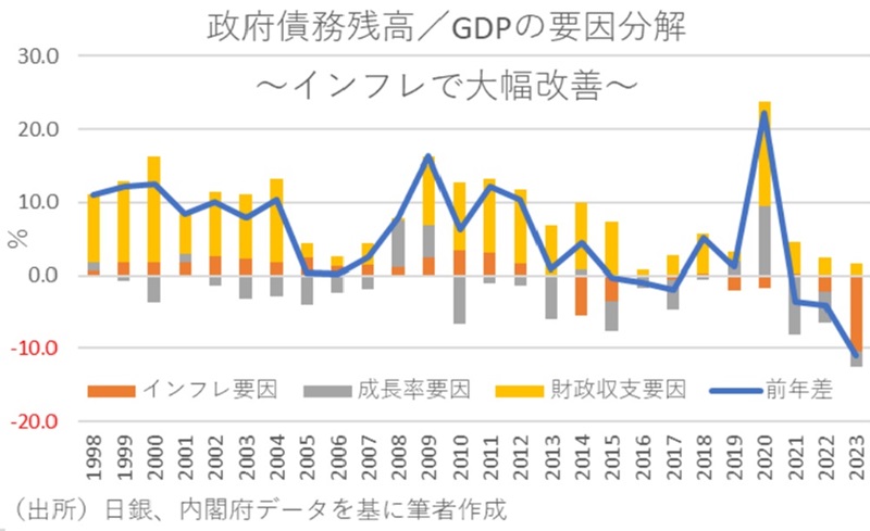 政府債務残高/GDPが低下した要因について、その前年差を基礎的財政収支要因と利払い費要因を合わせた「財政収支要因」「経済成長率要因」「インフレ率要因」に分解した結果をみると、低下幅の9割以上がインフレ率要因であることがわかる。