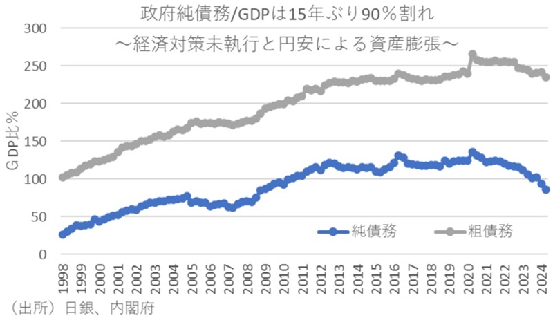 近年の財政指標は改善が続いている。日銀の資金循環統計によれば、24年6月末の一般政府債務残高/GDP比はコロナ前の水準まで戻っている。また、純債務/GDP比に至っては、実に15年ぶりの水準まで下がっている。背景には、円安に伴う法人税収増や物価高に伴う消費税収増、さらにはブラケットクリープ現象に伴う所得税収増などがあり、国民民主党も自党が主張する「年収の壁」の103万円から178万円への引き上げの財源は税収の上振れで賄えるとしている。