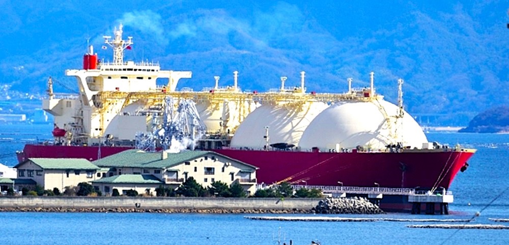 写真はLNGタンカー。LNG(液化天然ガス)タンカーは、天然ガスをの極低温で液化し、体積を600分の1に圧縮して大量輸送する専用船。魔法瓶構造の特殊タンクや自然気化ガスを燃料にするシステムを持ち、安全かつ高効率にエネルギーを運ぶ。