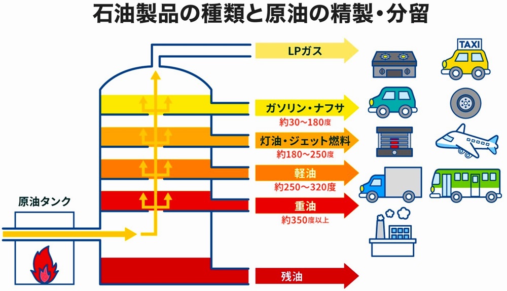 輸入された原油はそのままでは使えないため、製油所(せいゆじょ)にある巨大な装置で加熱・分離され、人の生活に欠かせない燃料や原料へと姿を変える。