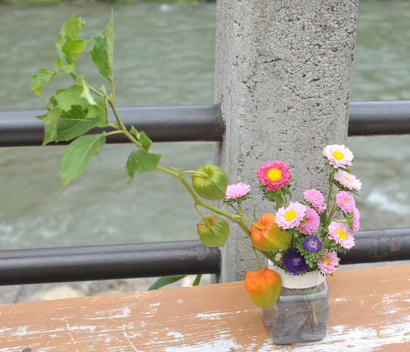 宿の近くに川があった。鯉が遊んでいる川岸に無操作に空き瓶に活けたホオズキがあった。一緒に活けてある花の名は知らない。ホオズキはお盆を忍ばせる。旅の地は日本の風習を残す地であるように思われる。