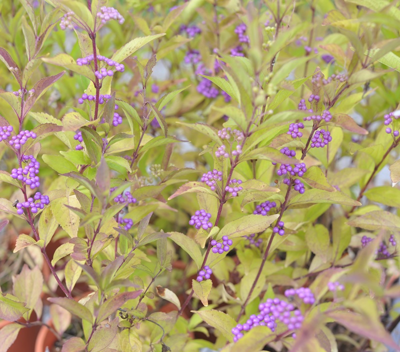 ムラサキシキブ(紫式部)。紫色の実は未だ熟していない。もっと紫色になる。花は初夏の6月~8月に付ける落葉低木。
