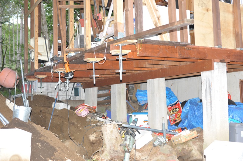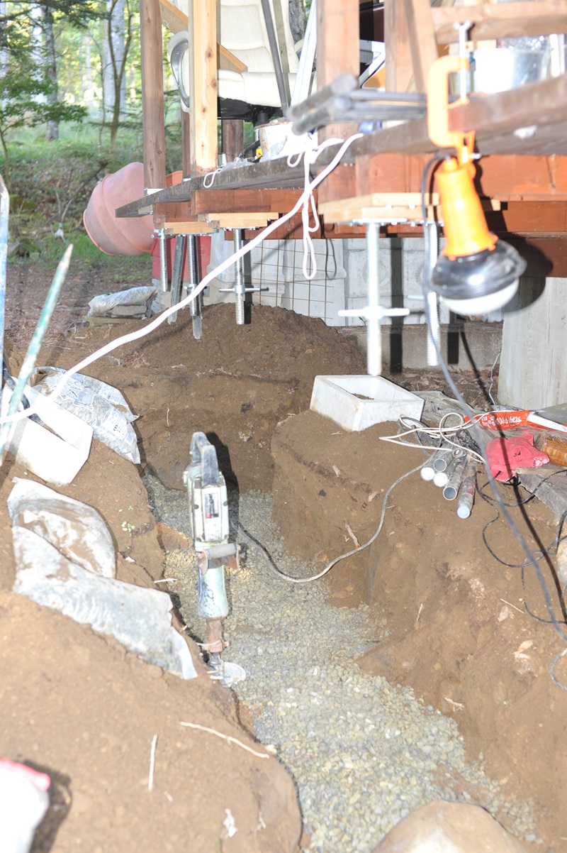 支柱は2mになる高さであり、これの強度をどのように確保するか思案した。コの字型に10mの長さ、そして大きな石に突き当たるまで掘り進めある部分は1mの深さまで掘削した。大きめの砂利を敷いて電動鎚打ち機でたたいて固めて、8個のがっちりした基礎の台を置いて、その周りをコンクリートで固めた。基礎の台から居間兼喫茶室に支柱を伸ばして補強する。床下は地下室として物置に使う。