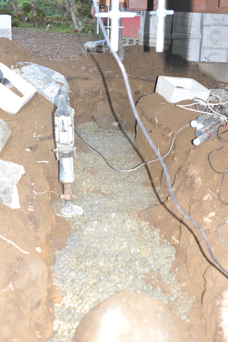 土台になる部分は大きな石がに突き当たるまで掘り進めた。砕石を20㎝ほど敷いて電動のランマ―(土堅め機)で叩いた。