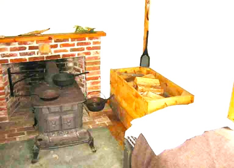 両側に窓。夏と冬でベッドの配置が変ることが想像される。外目には暖炉の様相であるが薪をくべる部分に鋳物製の薪ストーブが設置されていて暖炉の煙突は薪ストーブの煙突として使われたことになる。
