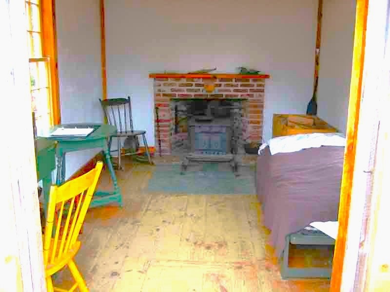 外目には暖炉の様相であるが薪をくべる部分に鋳物製の薪ストーブが設置されていて暖炉の煙突は薪ストーブの煙突として使われたことになる。一人用のベッドと机一つ、椅子三脚が見える。