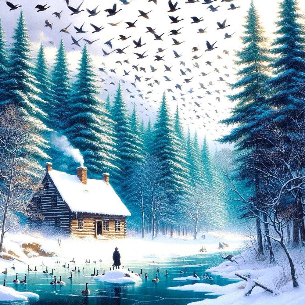 ウォールデン・森の生活を描く絵は実際のそれよりも物語風に美化されている。建物も大きいし、自然を美しく描いている。冬には雪が降りモミの木が白くなる。ログハウスの二階建ての絵になっているが実際には漆喰造りの5坪(15平方メートル)のワンルーム。