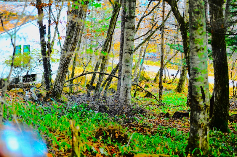 灰色の樹肌のシラビソと右手にアカマツ、左手はミズナラが生えている。山荘の庭の北西の一部。2025年11月10日14:20撮影。意図なくしてシャッターを切った一枚。